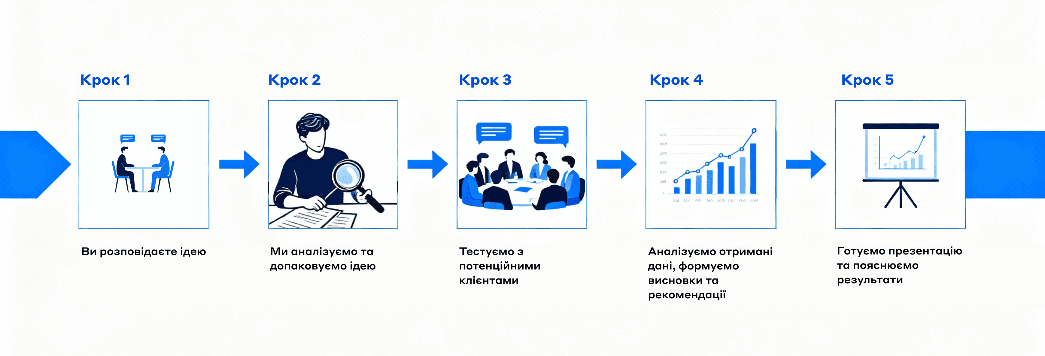 Ми перевіряємо ідею з реальними представниками вашої цільової аудиторії. Збираємо відгуки: що подобається, що ні, які зміни потрібні. Це не теоретичний опит — це прямі інсайти від людей, які могли б стати вашими клієнтами.
